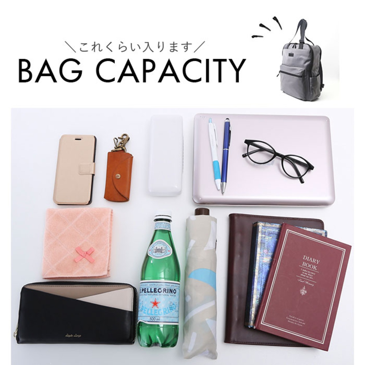 ・ポーチやボトル類、お弁当箱も収納可能。お出かけやビジネス用、マザーズバッグとして重宝。