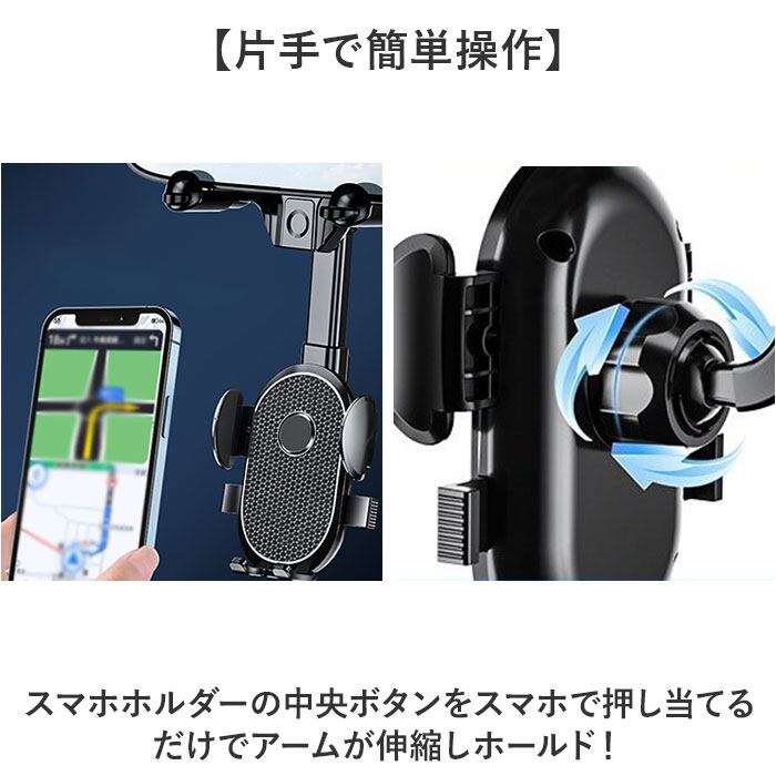 ・スマホホルダーの中央ボタンをスマホで押し当てるだけでアームが伸縮しホールド!