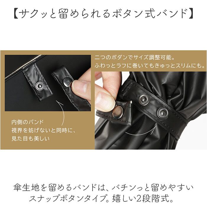 ・傘生地を留めるバンドは、バチンっと留めやすいスナップボタンタイプ。嬉しい2段階式。