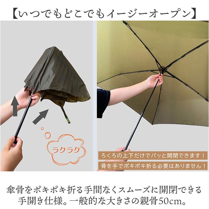 ・傘骨をポキポキ折る手間なくスムーズに開閉できる手開き仕様。一般的な大きさの親骨50cm。