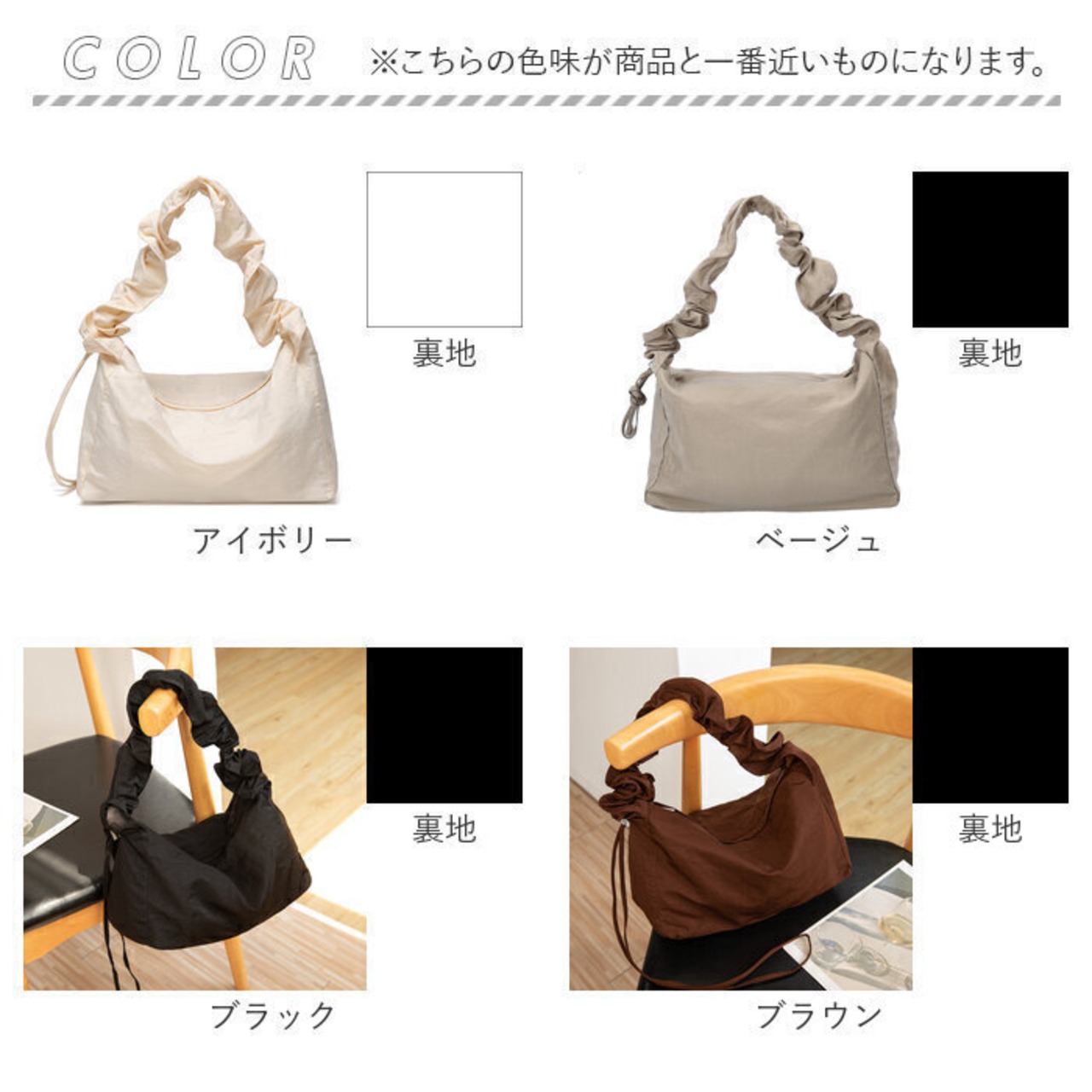 ・短く絞ってハンドバッグ、緩く絞って肩掛け、全部伸ばしてショルダーと簡単チェンジ。