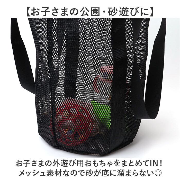 ・お子さまの外遊び用おもちゃをまとめてIN!メッシュ素材なので砂が底に溜まらない◎