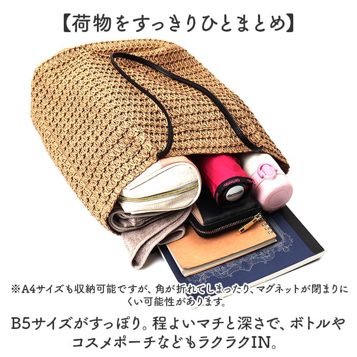 ・B5サイズがすっぽり。程よいマチと深さで、ボトルやコスメポーチなどもラクラクIN。