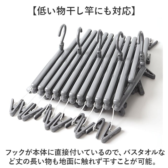 ・フックが本体に直接付いているので、バスタオルなど丈の長い物も地面に触れず干すことが可能。