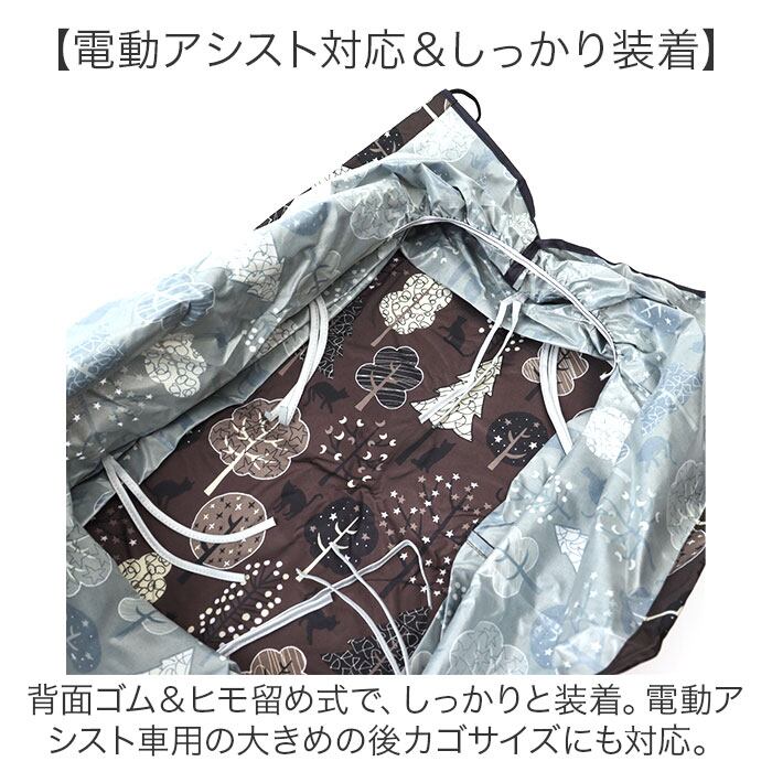 ・背面ゴム&ヒモ留め式で、しっかりと装着。電動アシスト車用の大きめの後カゴサイズにも対応。