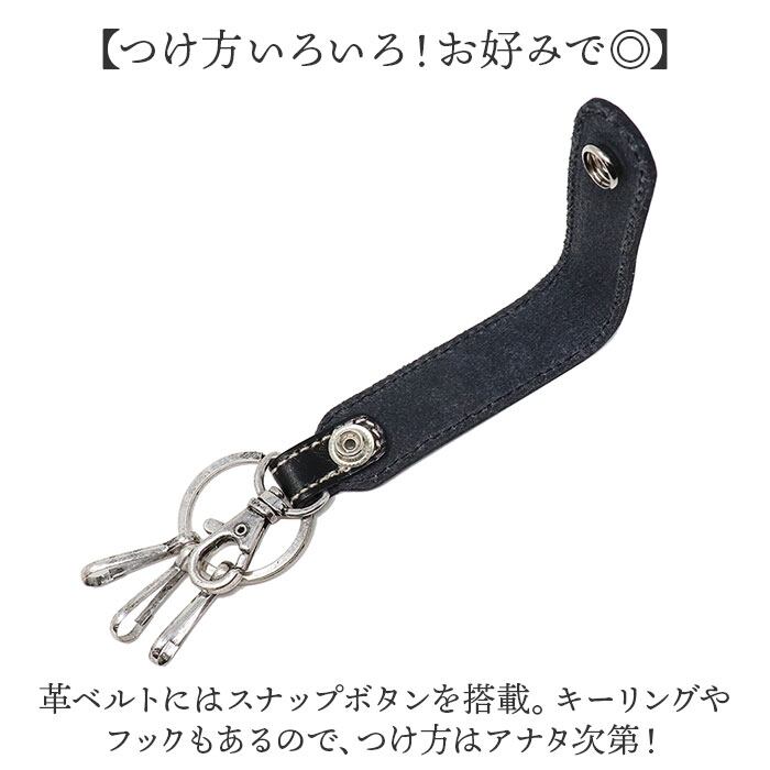 ・革ベルトにはスナップボタンを搭載。キーリングやフックもあるので、つけ方はアナタ次第!