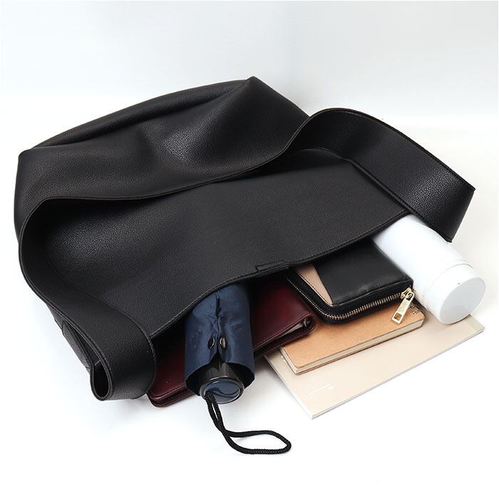 ・表面はシボ感のある1枚仕立てのフェイクレザー。くったりとした質感がポイント。