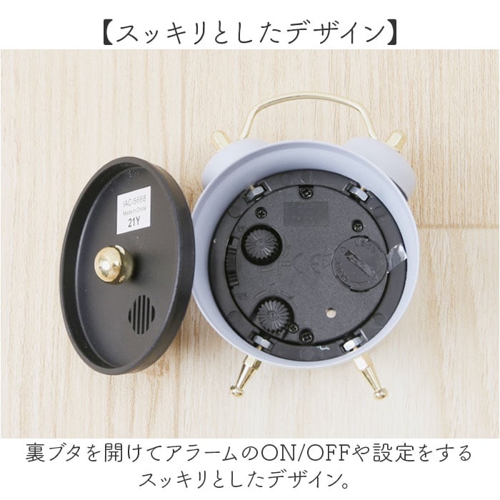 ・裏ブタを開けてアラームのON/OFFや設定をするスッキリとしたデザイン。