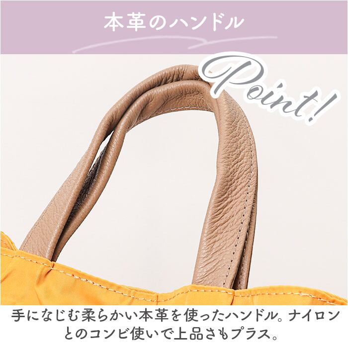 ・手になじむ柔らかい本革を使ったハンドル。ナイロンとのコンビ使いで上品さもプラス。
