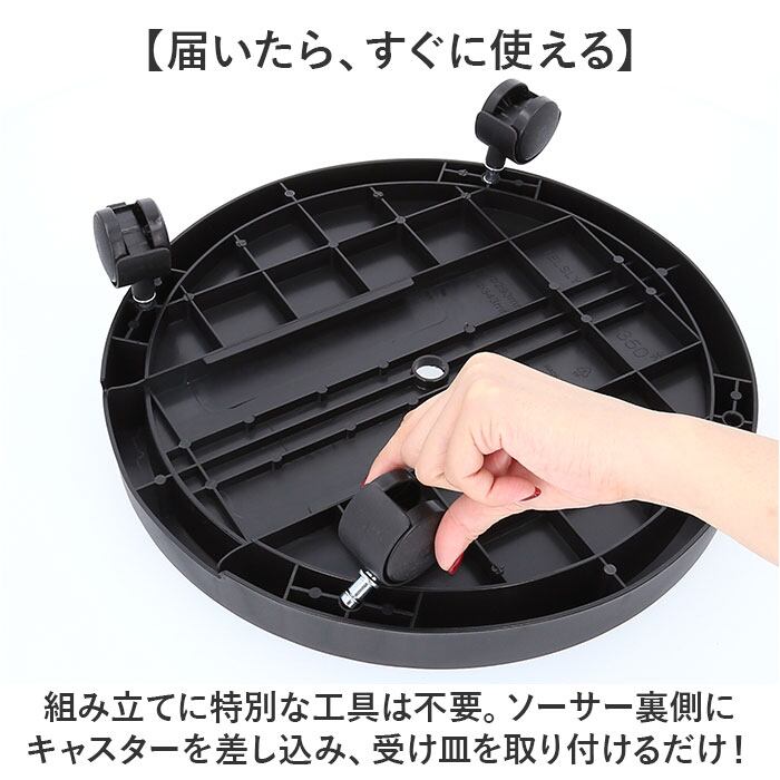 ・組み立てに特別な工具は不要。ソーサー裏側にキャスターを差し込み、受け皿を取り付けるだけ!