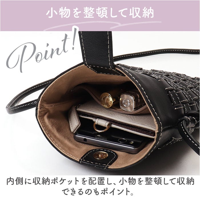 ・内側に収納ポケットを配置し、小物を整頓して収納できるのもポイント。
