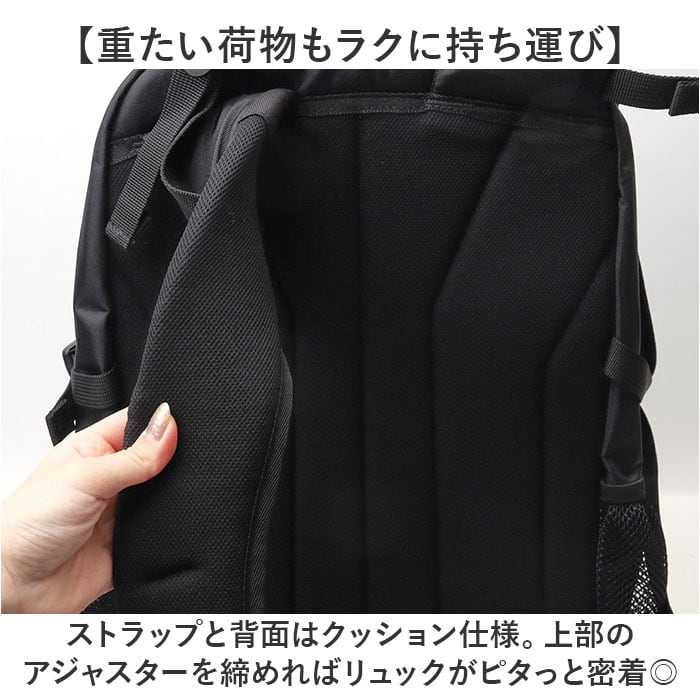 ・ストラップと背面はクッション仕様。上部のアジャスターを締めればリュックがピタっと密着◎
