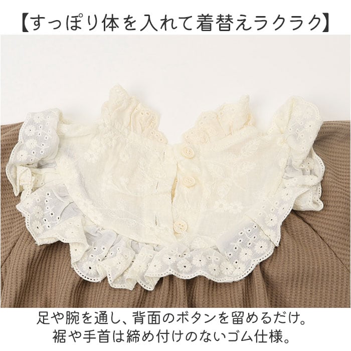 ・足や腕を通し、背面のボタンを留めるだけ。裾や手首は締め付けのないゴム仕様。