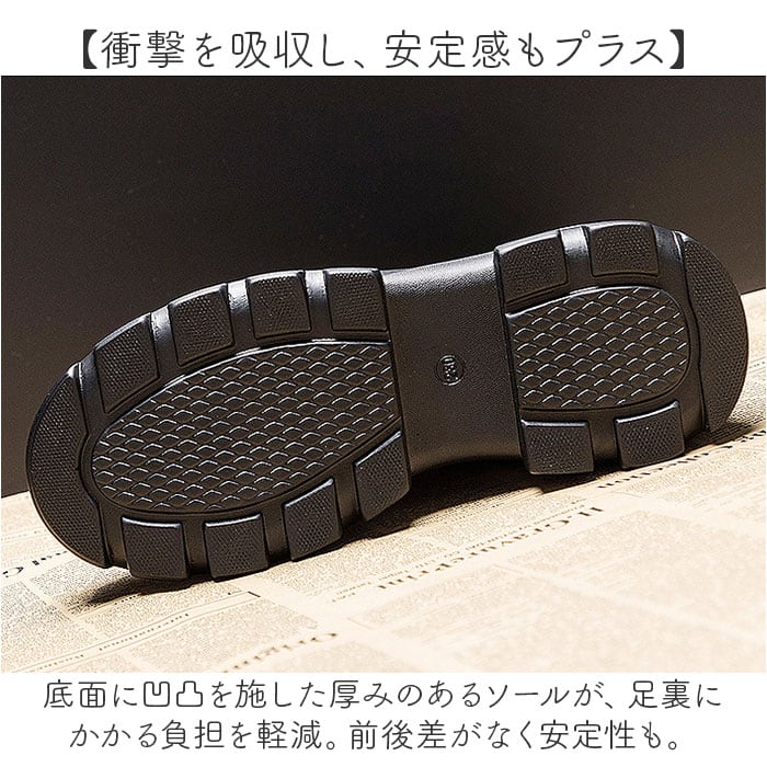 ・底面に凹凸を施した厚みのあるソールが、足裏にかかる負担を軽減。前後差がなく安定性も。