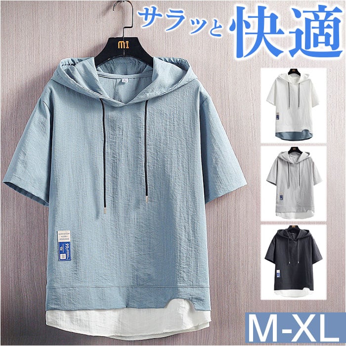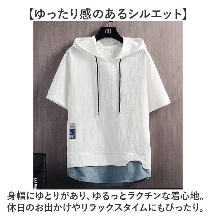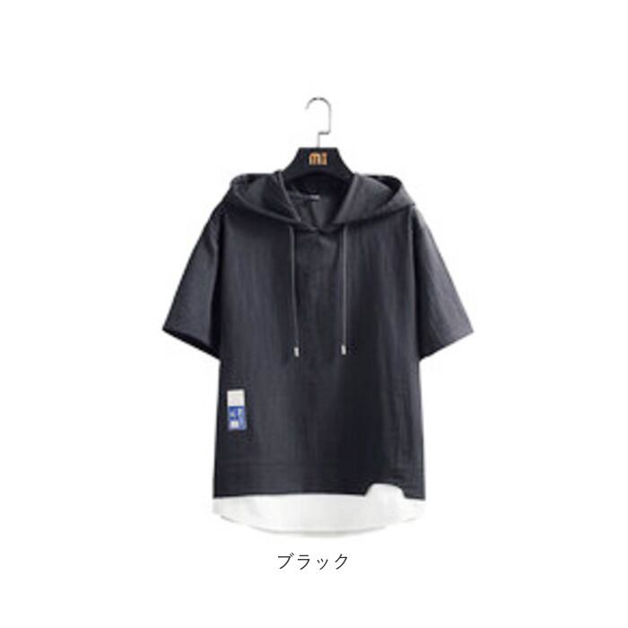 半袖パーカー メンズ 夏用 通販 パーカー 半袖 夏 フード付きTシャツ プルオーバーパーカー Tシャツ トップス 薄手 切り替え レイヤード風 通気性 速乾性 シンプル カジュアル 重ね着風 通学 お出かけ おしゃれ オシャレ 夏服 メンズファッション
