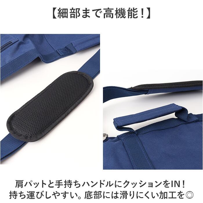 ・肩パットと手持ちハンドルにクッションをIN!持ち運びしやすい。底部には滑りにくい加工を◎