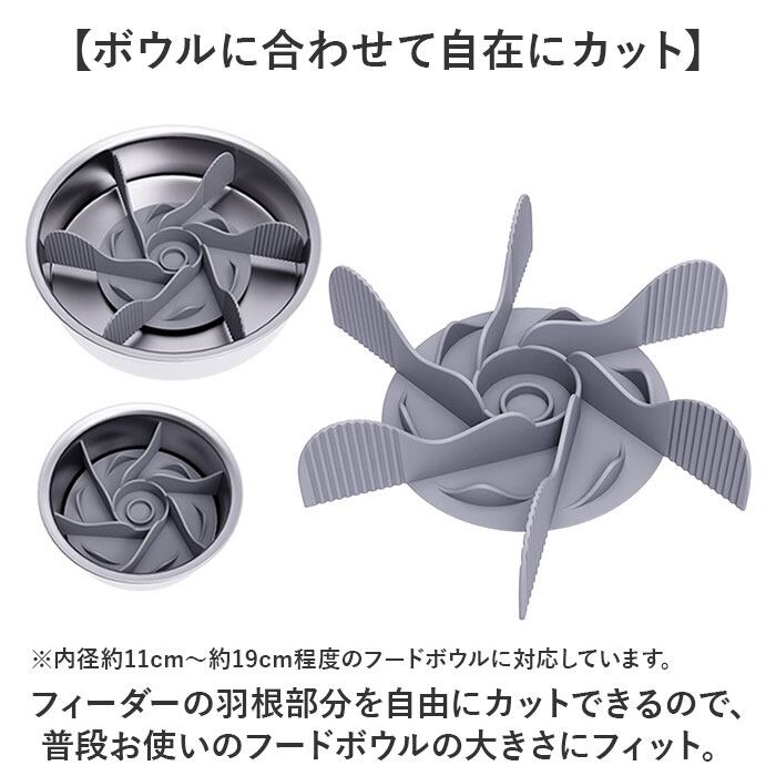 ・フィーダーの羽根部分を自由にカットできるので、普段お使いのフードボウルの大きさにフィット。