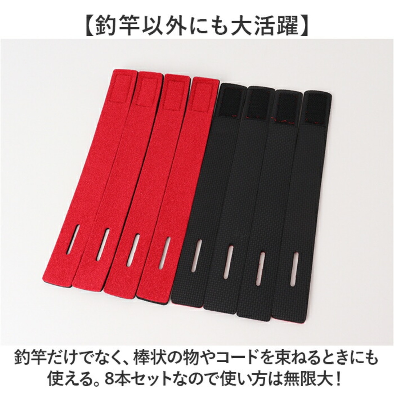 ・釣竿だけでなく、棒状の物やコードを束ねるときにも使える。8本セットなので使い方は無限大!