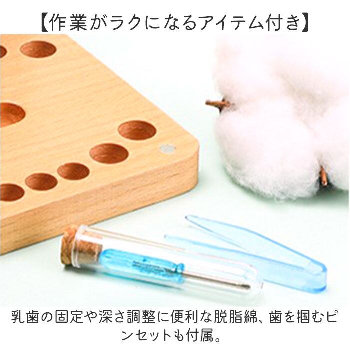 ・乳歯の固定や深さ調整に便利な脱脂綿、歯を掴むピンセットも付属。