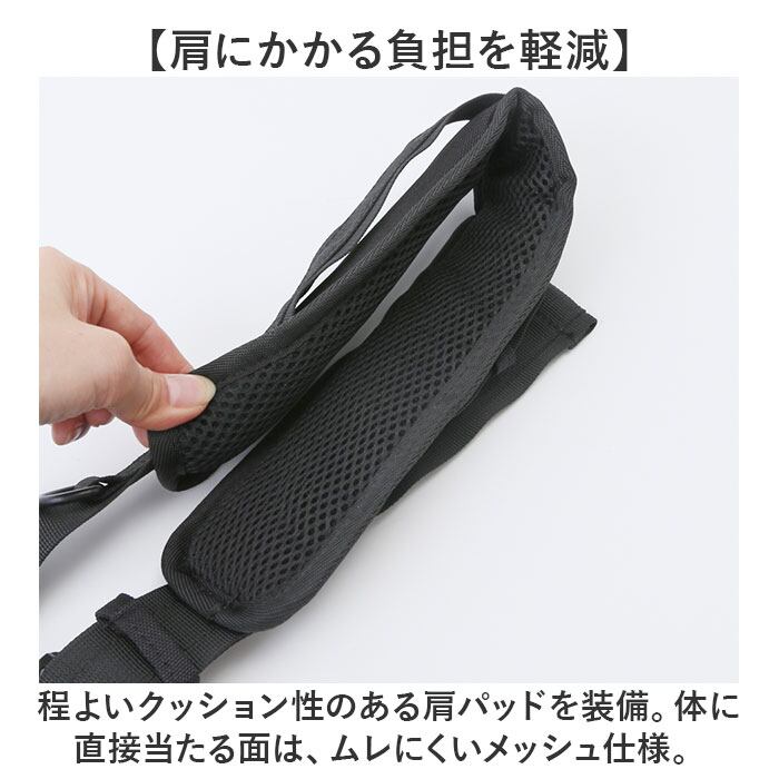 ・程よいクッション性のある肩パッドを装備。体に直接当たる面は、ムレにくいメッシュ仕様。