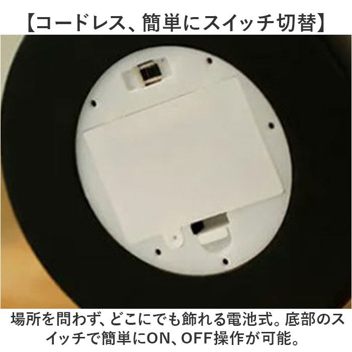 ・場所を問わず、どこにでも飾れる電池式。底部のスイッチで簡単にON、OFF操作が可能。