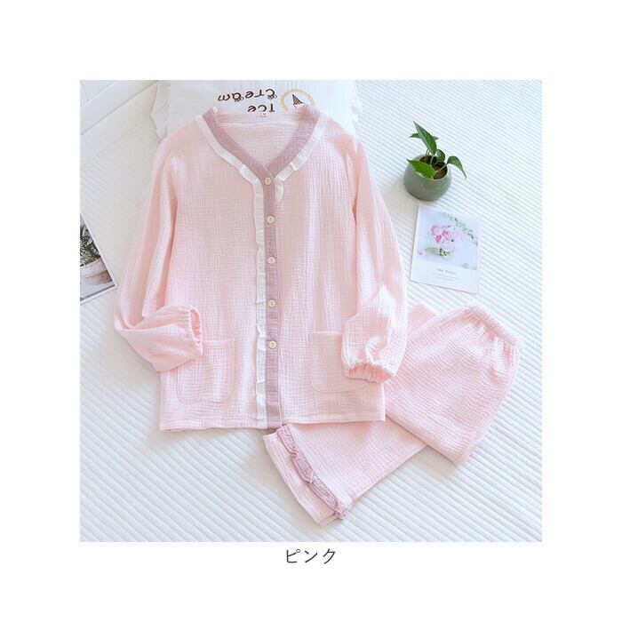ルームウェア レディース 上下セット 通販 前開き セットアップ コットン パジャマ 部屋着 長袖 ズボン パンツ 長ズボン かわいい 可愛い オシャレ おしゃれ ゆったり 寝間着 無地 春 秋 ガーゼ 綿 ウエストゴム 袖口ゴム 柔らかい オールシーズン
