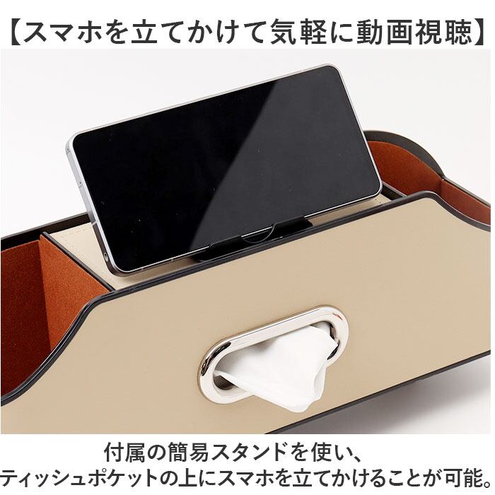 ・付属の簡易スタンドを使い、ティッシュポケットの上にスマホを立てかけることが可能。
