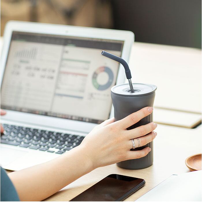 ・口当たりの優しいシリコーンストロー。リップ跡が付きにくく金属の摩擦音を抑えるカバー付き。