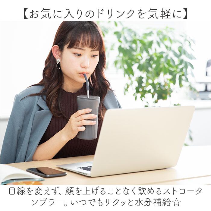 ・目線を変えず、顔を上げることなく飲めるストロータンブラー。いつでもサクッと水分補給☆