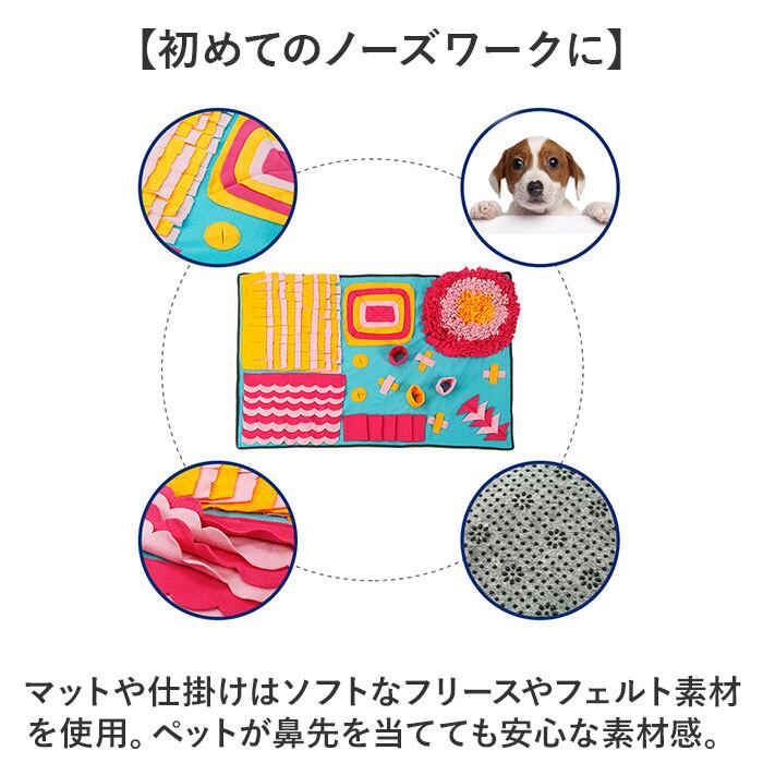 ・マットや仕掛けはソフトなフリースやフェルト素材を使用。ペットが鼻先を当てても安心な素材感。