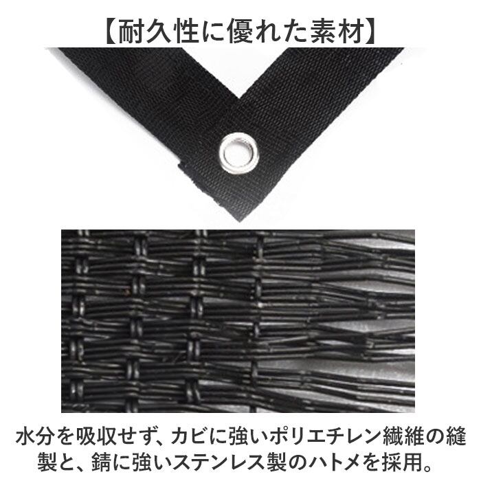 ・水分を吸収せず、カビに強いポリエチレン繊維の縫製と、錆に強いステンレス製のハトメを採用。