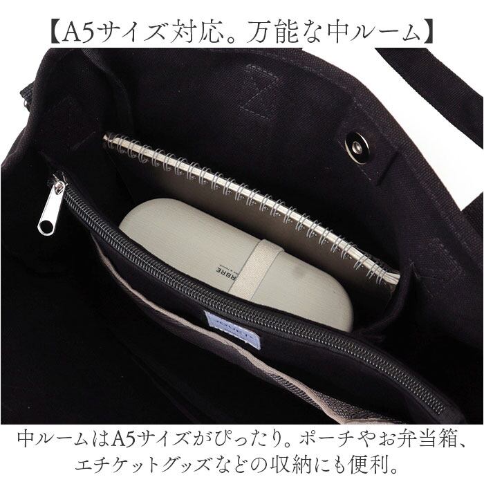 ・中ルームはA5サイズがぴったり。ポーチやお弁当箱、エチケットグッズなどの収納にも便利。