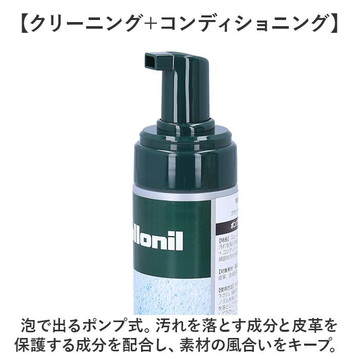 ・泡で出るポンプ式。汚れを落とす成分と皮革を保護する成分を配合し、素材の風合いをキープ。