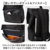 ・フロントには小物を収納できるポケットを採用。背面ファスナーはメイン収納にアクセス可能◎