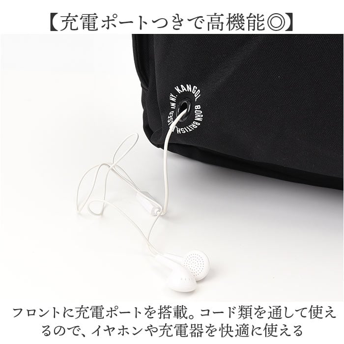 ・フロントに充電ポートを搭載。コード類を通して使えるので、イヤホンや充電器を快適に使える
