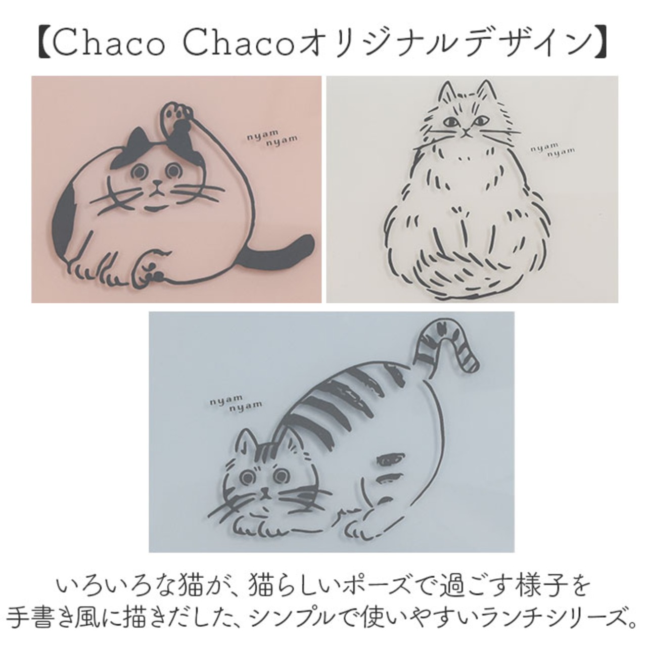・いろいろな猫が、猫らしいポーズで過ごす様子を手書き風に描きだした、シンプルで使いやすいランチシリーズ。