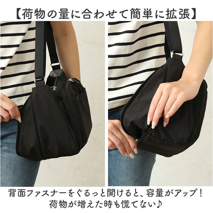 ・背面ファスナーをぐるっと開けると、容量がアップ!荷物が増えた時も慌てない♪