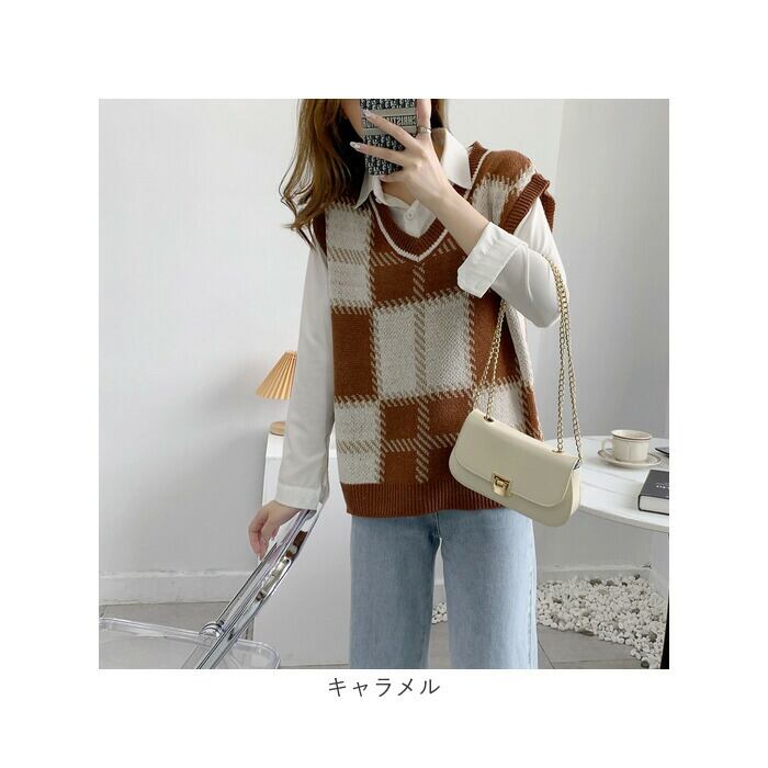 チェック柄ニットベスト Vネック mmcheckv27h