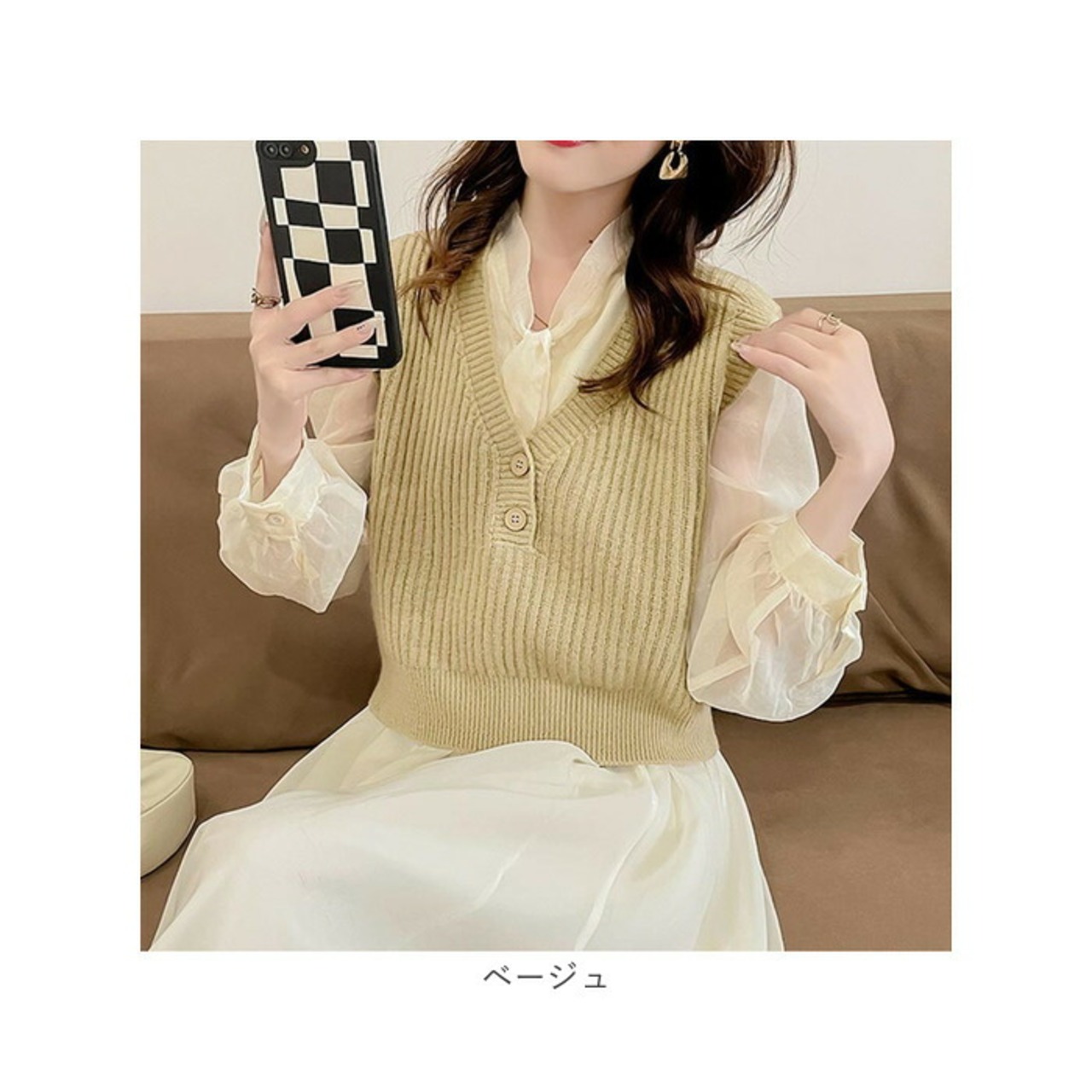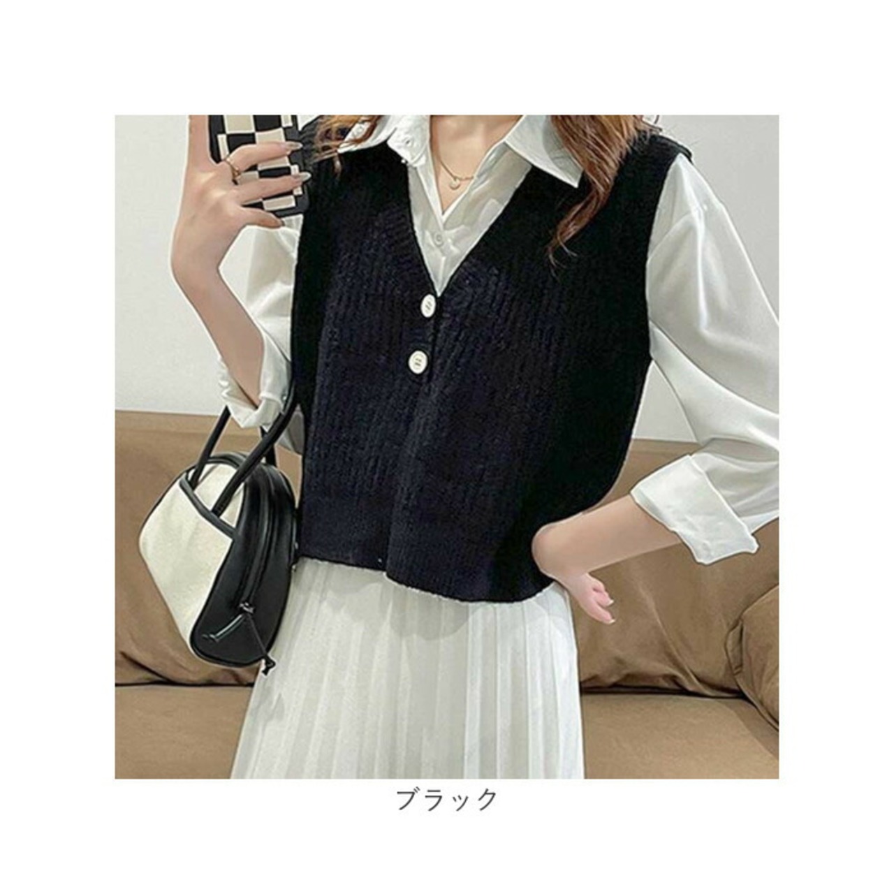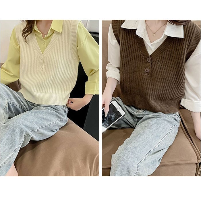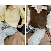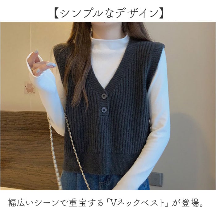 ・頭からすっぽり被るだけのスタンダードなベスト。胸元のボタンがアクセント。