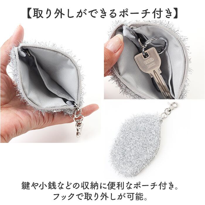 ・鍵や小銭などの収納に便利なポーチ付き。フックで取り外しが可能。