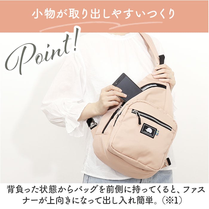 ・ショルダーの長さを調節して斜め掛け。自転車移動や、アクティブシーンでも快適。