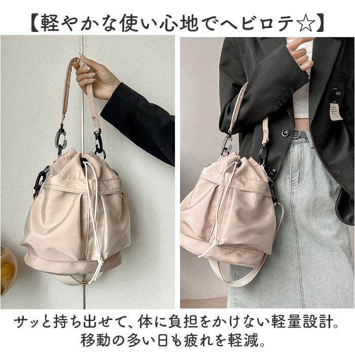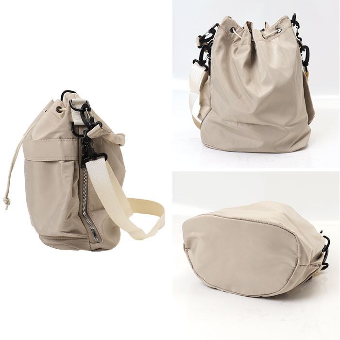 ・開口部は絞り具合を調節できるドローコードタイプ。開閉しやすく中身の飛び出しも防ぐつくり。