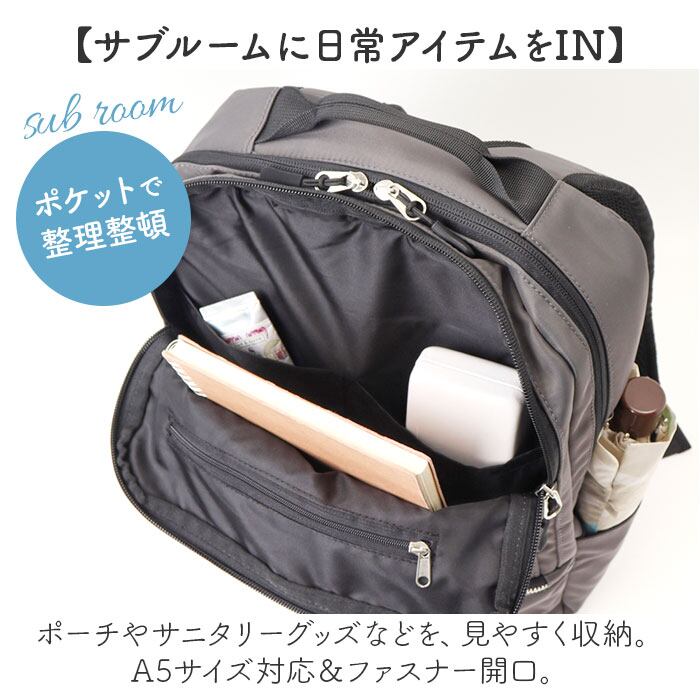 ・サブルーム内側:オープンポケット×2、ファスナーポケット×1