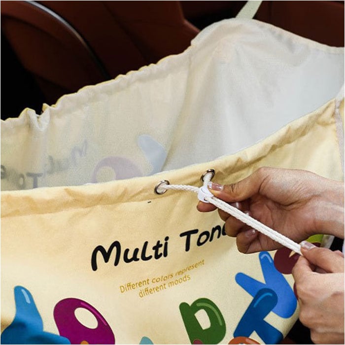 ・両サイドのマチをストッパー付きコードでキュッと絞ると、肩掛けトートバッグにもなる2WAY仕様。