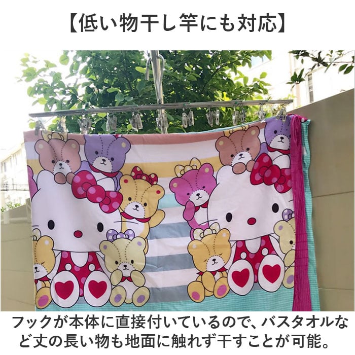 ・フックが本体に直接付いているので、バスタオルなど丈の長い物も地面に触れず干すことが可能。