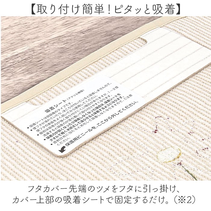 ・フタカバー先端のツメをフタに引っ掛け、カバー上部の吸着シートで固定するだけ。