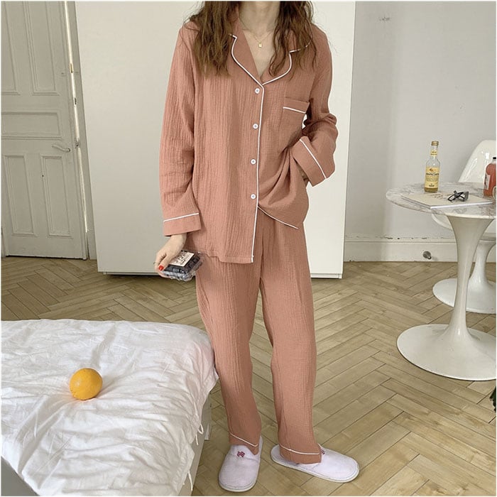 ・ベーシックデザインのトップス。襟元が程よく開いて、睡眠を妨げない!左胸元にポケット付き。