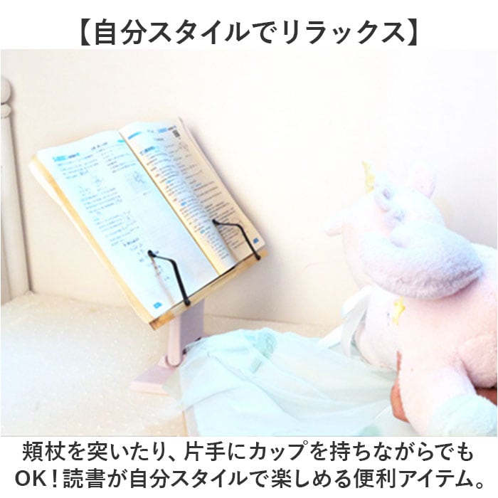 ・手に持って本を読むよりも目線が上がり、正しい姿勢をキープ。首や肩への負担も効果的に軽減。