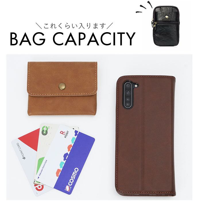 ・スマホやコインケース、モバイルバッテリーなどを収納できる大きさ。内ポケットも装備。