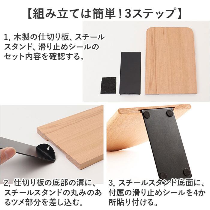 1.木製の仕切り板、スチールスタンド、滑り止めシールのセット内容を確認する。